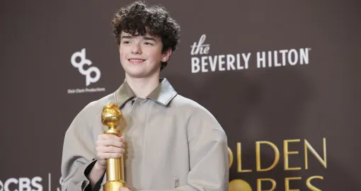 Owen Cooper poses with the Best Performance by a Male Actor in a Supporting Role on Television award for "Adolescence" at the 83rd Annual Golden Globes in Beverly Hills, California, U.S., January 11, 2026. REUTERS/Mario Anzuoni/Mario Anzuoni