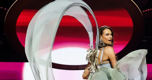 Tokom večeri Lima je nosila i drugu kombinaciju - providni, svjetlucavi bodi ukrašen kamenčićima i sjajne donje dijelove. Nosila je sandale s tankim kaišićima i zračila osmijehom dok je nosila zlatna krila s pernatim detaljima. Njena šminka bila je glamurozna: ružičasto rumenilo naglašavalo je jagodice, dok je sjajni topli ruž upotpunio izgled.