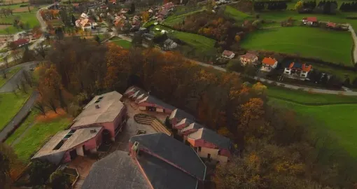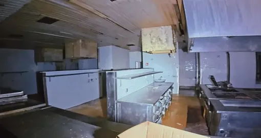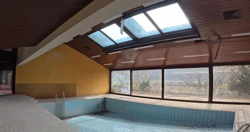 Na snimku je prikazana unutrašnjost kompleksa koja kao da je zamrznuta u vremenu, ogromna napuštena kuhinja, unutrašnji bazen, hodnici, ali i dvorana sa uredno poredanim stolicama.