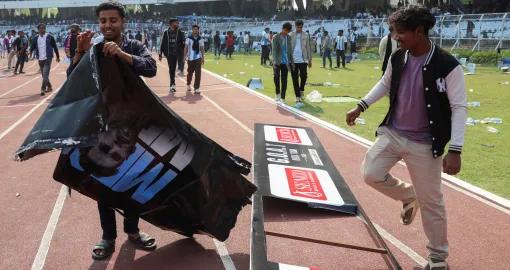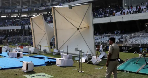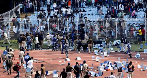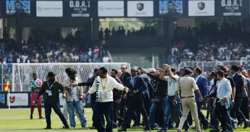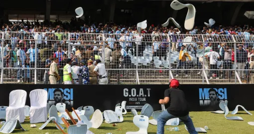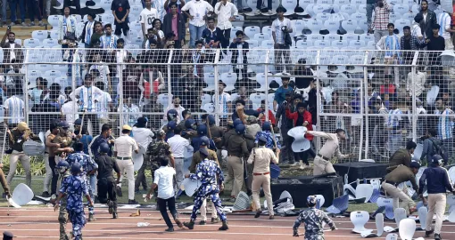 Soccer Football - Argentine soccer star Lionel Messi on a whirlwind tour of India - Vivekananda Yuva Bharati Krirangan, Kolkata, India - December 13, 2025 Riot police is deployed as disappointed fans throw chairs on the field after Argentine soccer star Lionel Messi leaves the stadium REUTERS/Sahiba Chawdhary/Foto: Sahiba Chawdhary