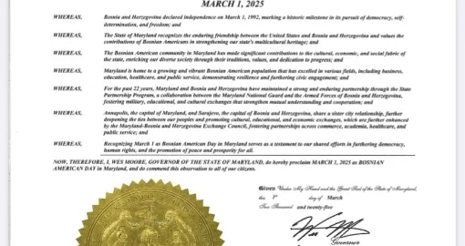 Ovogodišnji prijem povodom Dana nezavisnosti će ostati upamćen po izuzetnoj odluci Guvernera Savezne države Maryland, kojom se 1. mart proglašava Bosansko-američkim danom. Ovaj proglas je pročitao i uručio Ambasadoru Alkalaju zamjenik državnog sekretara Marylanda g. Michael Lore. Proglasom se ističe da je 1. mart 1992. godine historijska prekretnica kojom je Bosna i Hercegovina utrla svoj put demokracije, samoopredjeljenja i slobode, te da je program državnog partnerstva između Marylanda i Bosne i Hercegovine dokaz naših zajedničkih napora usmjerenih na unaprjeđenje demokracije, ljudskih prava, mira i prosperiteta za sve građane. Posebno je naglašena uloga Vijeća za saradnju između Marylanda i Bosne i Hercegovine koje predano radi na jačanju saradnje u okviru državnog partnerstva.