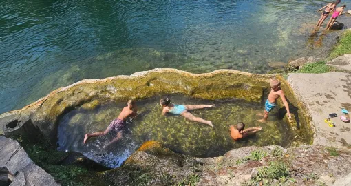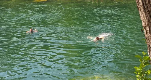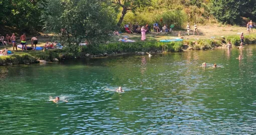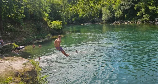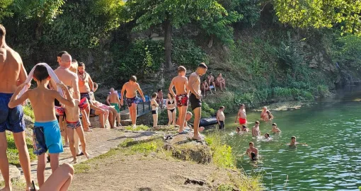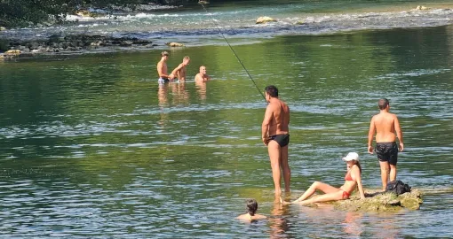 Vrbas niti je mlak, niti je leden, nego – taman. Kao dobar špricer. Jedni skaču sa stijenâ, drugi s drveća; jedni se spuštaju na gumama, drugi u dajacima; jednima je hladovina i predjelo i glavno jelo, drugi se prže i cvrče na suncu. Nizvodno je Švedska plaža, uzvodno je, u Karanovcu, Mali raj, pa ima vode za još deset puta ovoliko naroda.