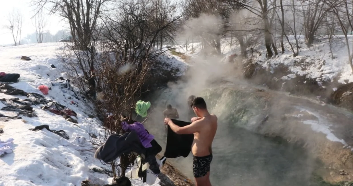 Naime, veća grupa migranata koristi kakvo-takvo januarsko sunce kako bi se okupala u ledenoj Željeznici, a koriste i dane bez snijega kako bi u vodi oprali odjeću i posteljinu koju im je uglavnom pružilo domaće stanovništvo.