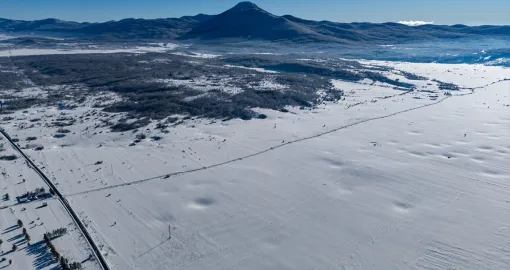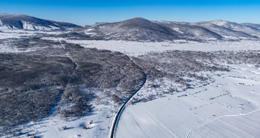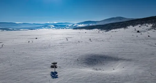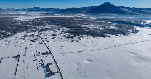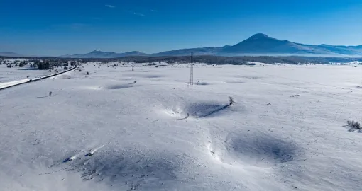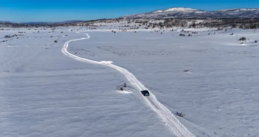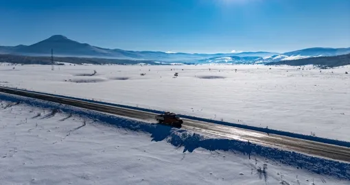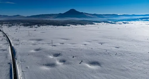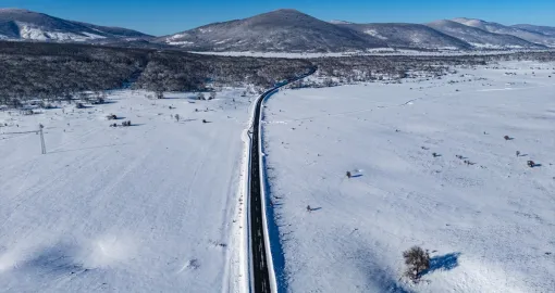 Bijeli pokrivač obavio je guste šume, prostrane livade i blage padine, dok se cesta provlači kroz tišinu zimskog ambijenta.