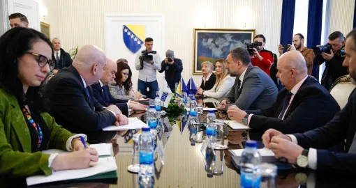 Njegov i doček izaslanstva upriličen je u zgradi Ministarstva vanjskih poslova BiH, gdje se sastaju sa domaćinom, ministrom vanjskih poslova BiH Elmedinom Konakovićem.