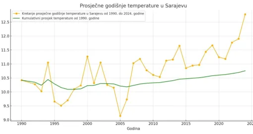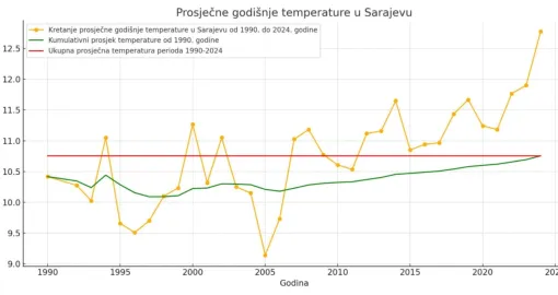 Prosječna temperatura u Sarajevu u periodu od 2020. do 2024. godine, dakle u pet godina koje nismo uračunali u raniji decenijski prosjek, iznosi 11,773, što je ogroman skok u odnosu na prethodnu deceniju, gotovo duplo veći u odnosu na skokove koji su zabilježeni u prethodnim decenijama, u jednoj u odnosu na drugu.