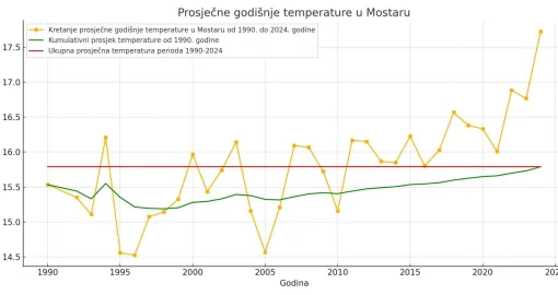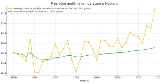 Grafički prikaz porasta temperatura i kumulativnog prosjeka temperatura u periodu od 1990. godine do danas za Mostar, uz dodatak prosjeka za ukupan period/