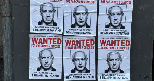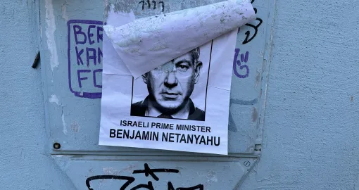 Na plakatima stoji portret Netanyahua uz natpis da je tražen zbog ratnih zločina i genocida po potjernici Međunarodnog krivičnog suda u Haagu.