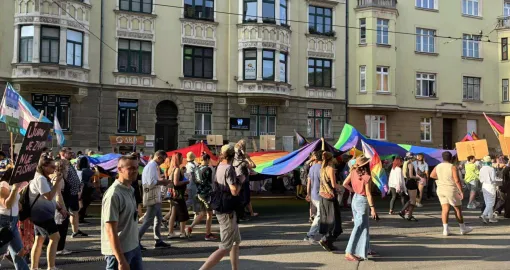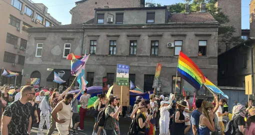 Paralelno sa zastavama Ponosa, u koloni su i poruke podrške Palestini – među transparentima se ističe natpis “Free Palestine”, a mogu se čuti povici “Sloboda za Gazu”.