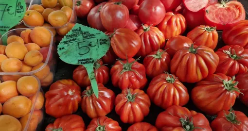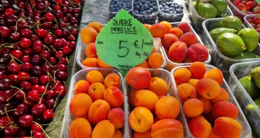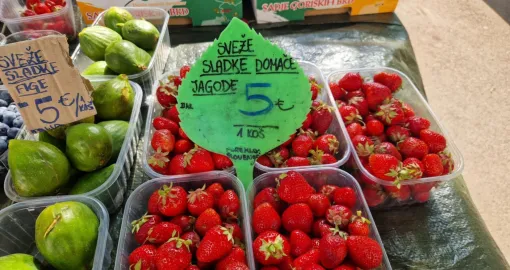 Kilogram paradajza (Volovsko srce) u Ljubljani košta pet eura, kao i jedna korpica jagoda. Kilogram kajsija možete kupiti za 7 eura, dok bi za kilogram trešanja morali izdvojiti devet eura. Ostatak cijena možete pogledati u našoj galeriji.