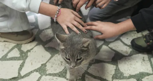 "On je naš školski mačak. Svi ga volimo, mazimo i pazimo. Najbolji smo prijatelji", kaže Esma Ghanomeh, učenica devetog razreda.