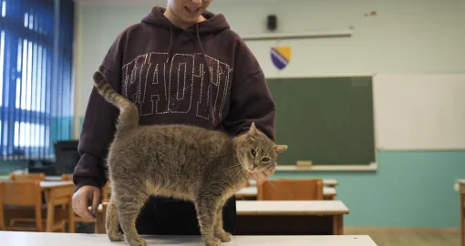 "Mislili smo da će, kada malo ojača, otići svojim putem, kao i svaka druga mačka. Međutim, on je ostao i prilagodio se", kaže direktorica škole Emina Hrnjić u razgovoru za Anadoliju.
