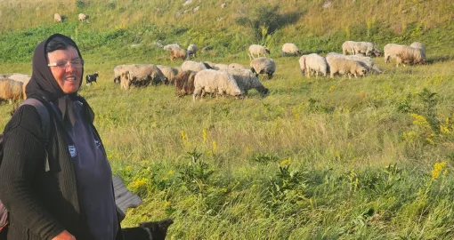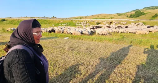 Budem od ujutro do naveče. Jutros sam izašla tako oko pola sedam. Sin će po mene u devet. Koliko ima ovaca? A de znaj. Bilo je toga, ali se i prodalo puno. Bilo ih je hiljadu i dvjesto, ali je otišlo podosta. Ima janjaca oko osam stotina, ja mislim. Svaki se dan ojanji bar jedna. Čuješ ovo kako bleji? Traži mater. Ostalo iza ostalih, pa ne znam gdje mu je. Ovnova ima dvadeset. Ima puno ovaca, pa mora biti puno i ovnova. Kad se, da prostiš, mrču – ne može jedan ovan sve oposliti.