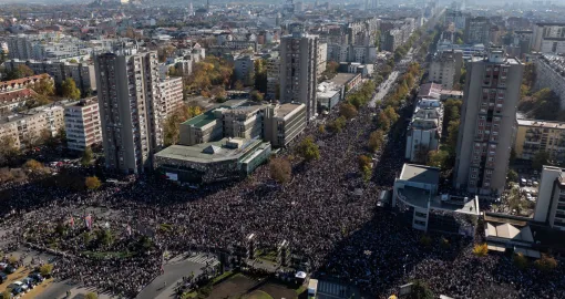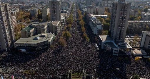 A drone view shows people gathering outside Novi Sad railway station during a commemorative service, on the first anniversary of the fatal November 2024 canopy collapse of the station, which killed 16 people, triggering nationwide accusations of widespread corruption and negligence, in Novi Sad, Serbia, November 1, 2025. REUTERS/Marko Djurica  TPX IMAGES OF THE DAY/Marko Djurica