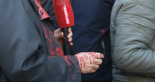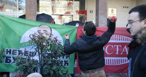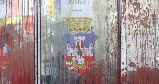 Okupljeni građani ispred Skupštine grada uzvikivali su "Ruke su vam krvave" i gađali su jajima i crvenom farbom zgradu gradske skupštine.