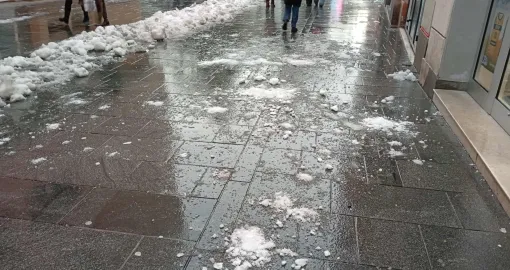 Snijeg i ledenice padaju sa zgrada na asfalt u Sarajevu.
