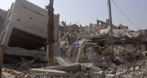 Džamija, gotovo potpuno razorena u udarima, sada služi kao privremeno sklonište porodicama koje među ruševinama pokušavaju preživjeti teške uslove i stalnu opasnost.