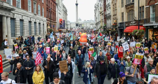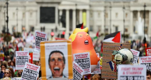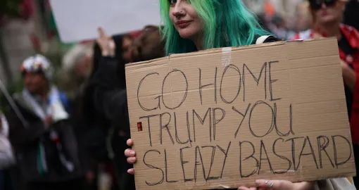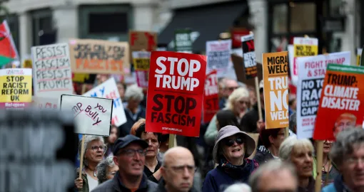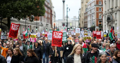 Demonstranti su se okupili u Portland Placeu na poziv koalicije "Stop Trump" da se usprotive Trumpovoj državnoj posjeti Velikoj Britaniji i njegovoj politici o imigraciji, klimatskim promjenama, a posebno njegovom stavu o Gazi.