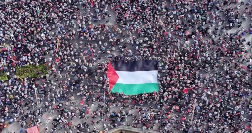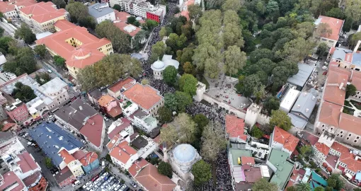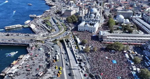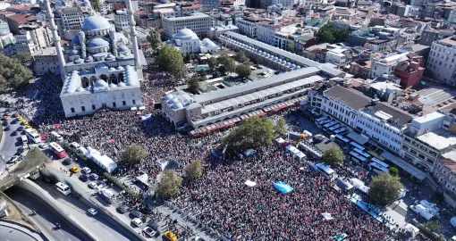 Snimak iz zraka prikazuje mase koje se okupljaju na maršu koji su organizirali Fondacija za humanitarnu pomoć (IHH) i Platforma za podršku Palestini u Istanbulu, Turska, u znak podrške Flotili slobode.