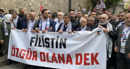 Ljudi razvijaju transparent na kojem piše "Dok Palestina ne bude slobodna" dok se mnoštvo okuplja na maršu, prenosi Anadolija.