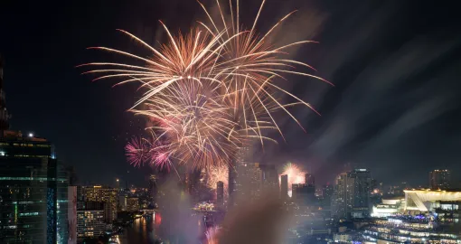 BANGKOK, TAJLAND - 1. JANUAR: Vatromet obasjava noćno nebo duž rijeke Chao Phraya u Bangkoku, Tajland, 1. januara 2026. godine. Budući da je zemlja još uvijek u žalosti, predstava se održava pod temom "U vječnom poštovanju", u čast pokojne Njenog Veličanstva Kraljice Sirikit, Kraljice Majke, koja je preminula nekoliko mjeseci ranije. (Matt Hunt - Anadolu Agency)/