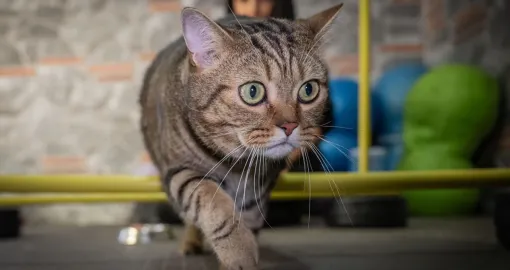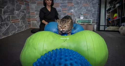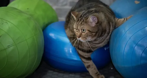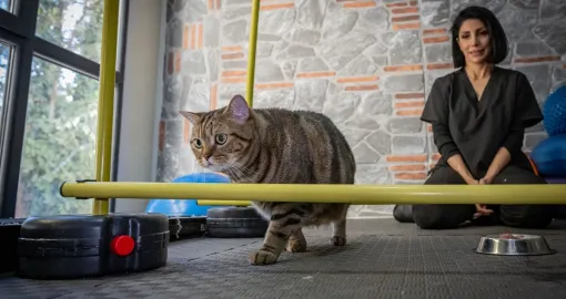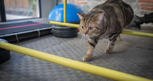 Mačka "Simba" pilatesom, plivanjem i drugim vježbama sa ličnim trenerom pokušava da se riješi gojaznosti i viška kilograma koje je dobila zbog neadekvatne ishrane i neaktivnosti.