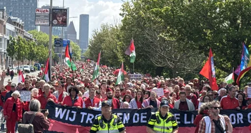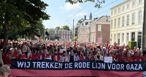 Okupljeni su marširali iza transparenta na kojem je pisalo: "Povucite crvenu liniju za Gazu" i skandirali slogane poput "Schoofova vlada je gluha", "Sramota za vladu, ruke su vam krvave", "Holandija plaća, Izrael bombarduje", "Oslobodite Palestinu", "Nema mira na okupiranim teritorijama", "Zaustavite genocid", "Zaustavite ubijanje djece".