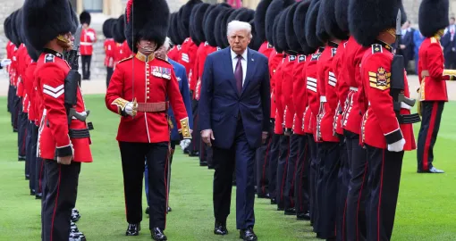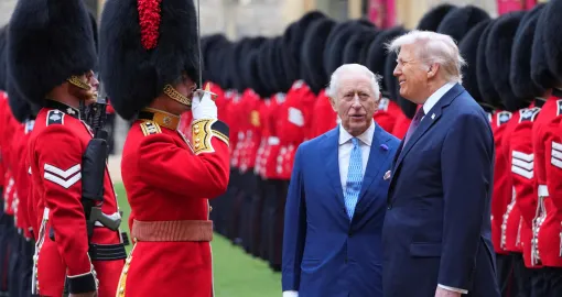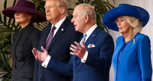 Nedugo zatim, američkog predsjednika i prvu damu pozdravili su i kralj Charles te kraljica Camilla, čime je zvanično otpočeo državni protokol ispunjen ceremonijalnim sadržajem. Trump se rukovao s kraljem Charlesom, a dvojica državnika su kratko razgovarala ispred dvorca, dok su Melania Trump, kraljica Camilla i princeza od Walesa razmijenile nekoliko riječi odvojeno.