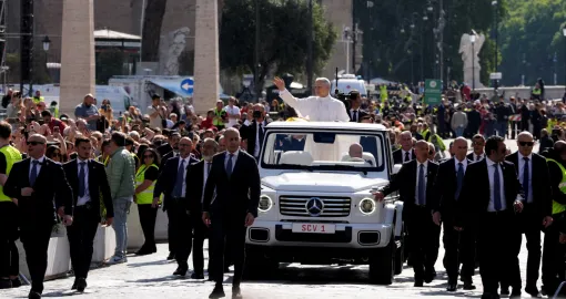 - Papa Lav XIV stigao je na Trg svetog Petra u papamobilu s otvorenim krovom, pozdravljajući mnoštvo okupljenih vjernika. Time on slijedi primjer pape Franje, koji je također odbacio neprobojnu zaštitu.